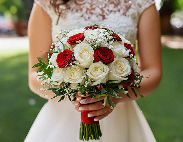 • Brautstrauß aus Rosen und Schleierkraut