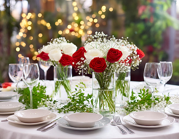 • Tischdekorationen mit Blumenarrangements und Kerzen