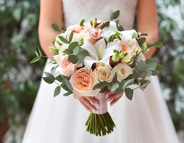 • Brautstrauß aus Rosen, Lilien und Eukalyptus
