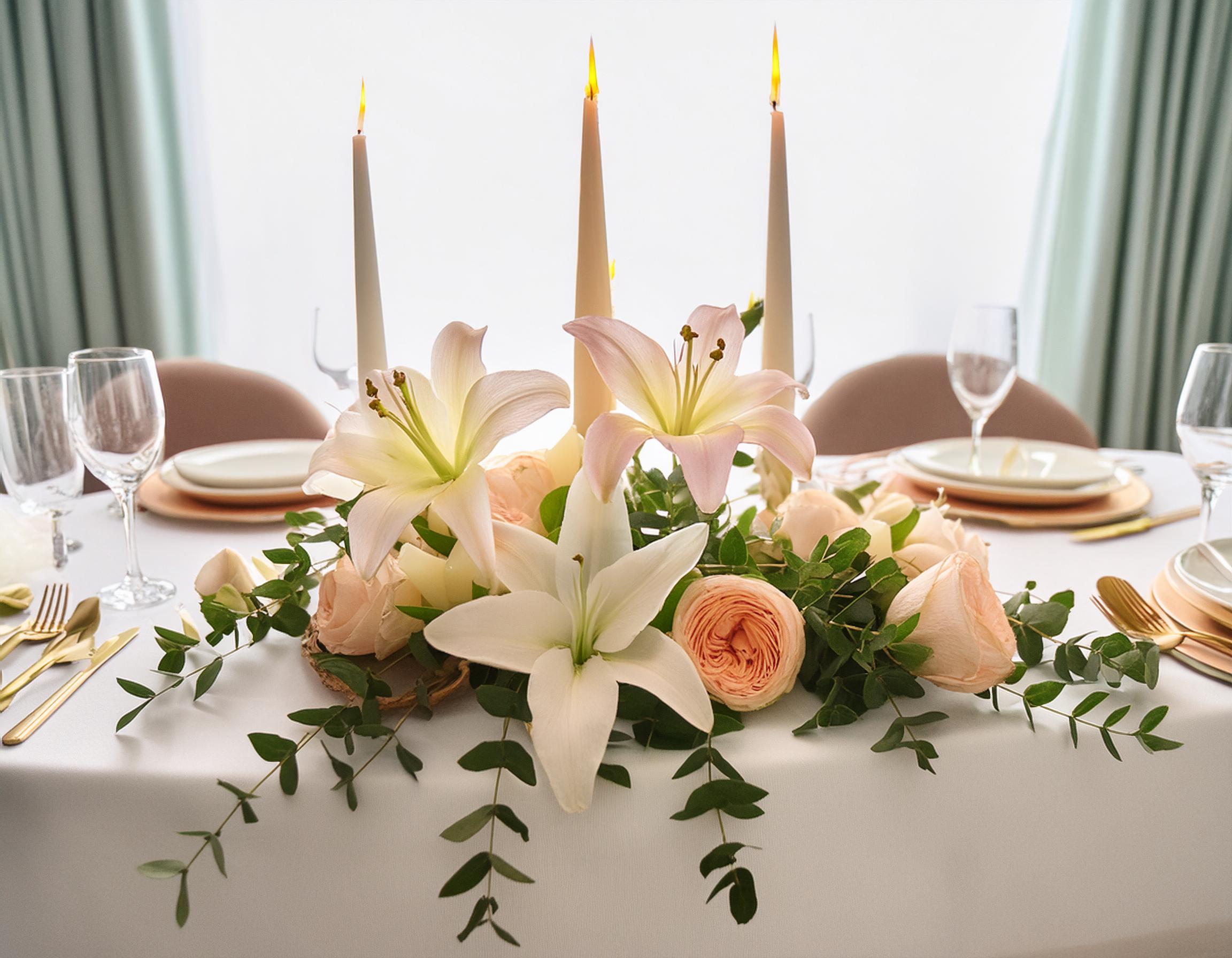 • Hochwertige Tischdekorationen mit Blumenarrangements, Kerzen und Kristallvasen