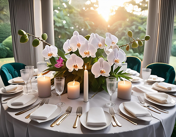 • Luxuriöse Tischdekorationen mit opulenten Blumenarrangements, Kerzen und exklusiven Gefäßen