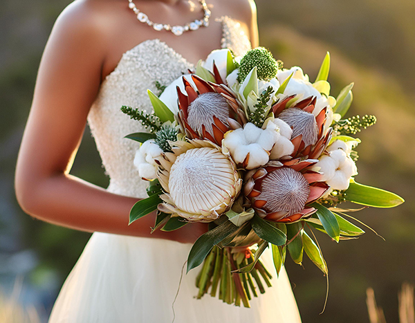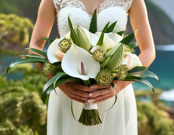 • Brautstrauß aus exotischen Blumen wie Calla-Lilien, Protea und Orchideen