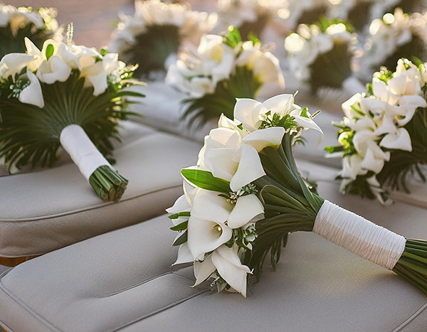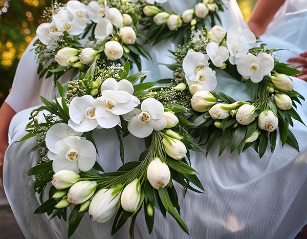 • Blumenkränze, Armbänder und Sträuße für die Brautjungfern